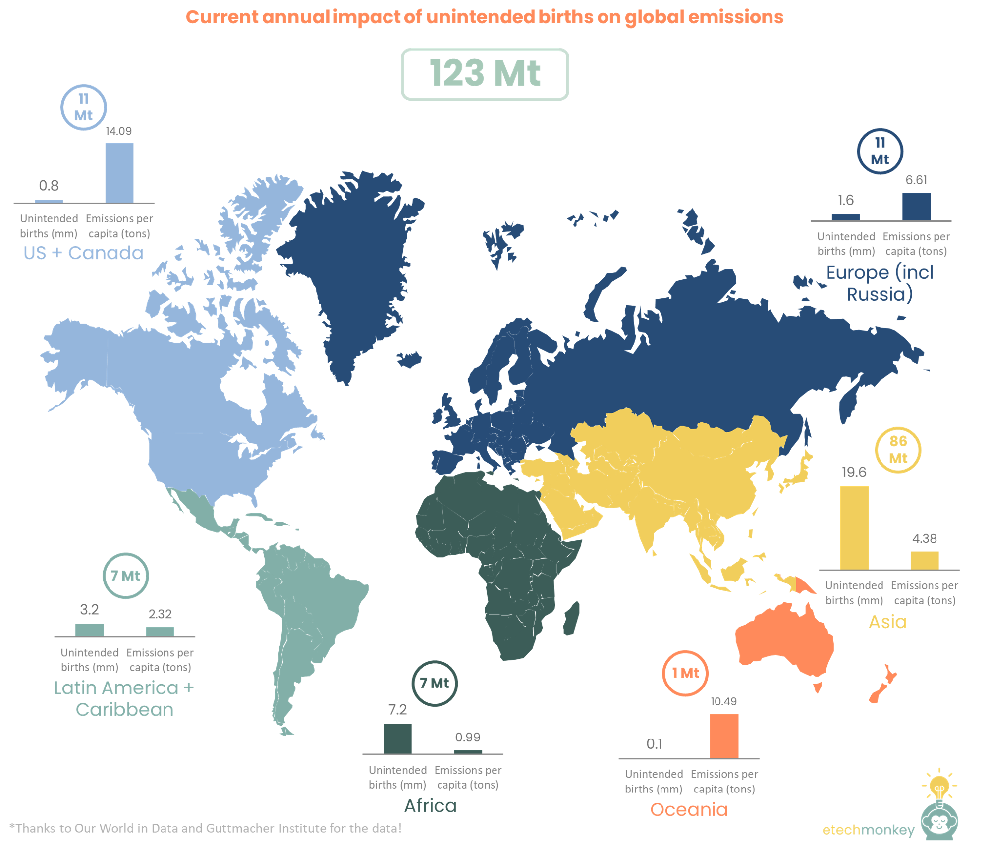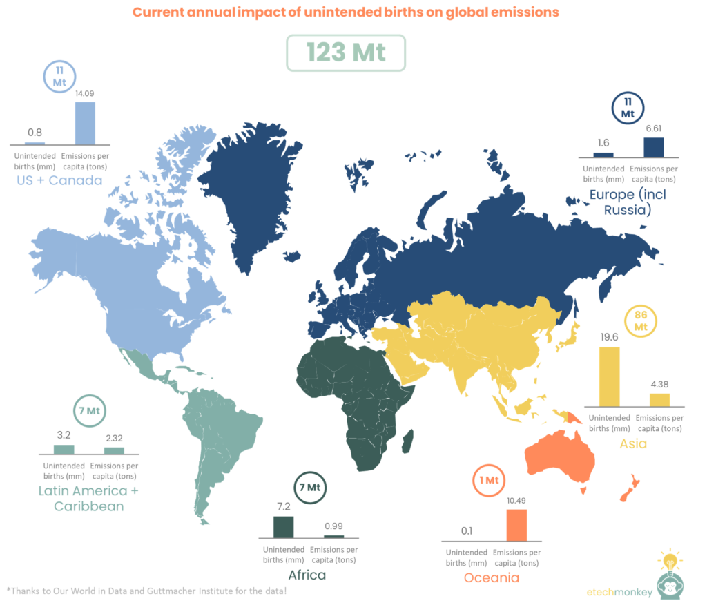 There are more than 120 million unintended pregnancies worldwide every year. Roughly 60% result in abortion, 27% result in live births, and the remaining 12% result in miscarriages / fetal losses. That’s nearly 32 million births that could have been avoided annually. The emissions impact of those 32 million people, when accounting for regional differences in per capita emissions and unintended births (unintended births tend to skew towards poorer regions with lower per capita emission and more births), is 123 Mt CO2e per year (weighted average emissions per capita of 3.7 tons), or ~0.3% of current world’s emissions. Adding in a 1.05% population growth, the annual emissions impact over the next 30 years of unintended births is ~144 Mt CO2e per year.