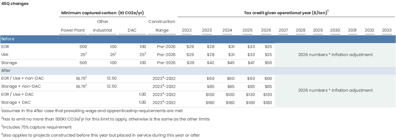 There’s a substantial uplift provided to the 45Q credits, near term doubling their value for non-DAC projects and quadrupling their value for DAC projects. With state incentives added in, projects should have access to anywhere from $60 – 260 worth of credits depending on their configuration. This should cross the breakeven point for most capture projects.