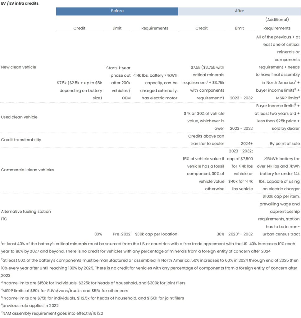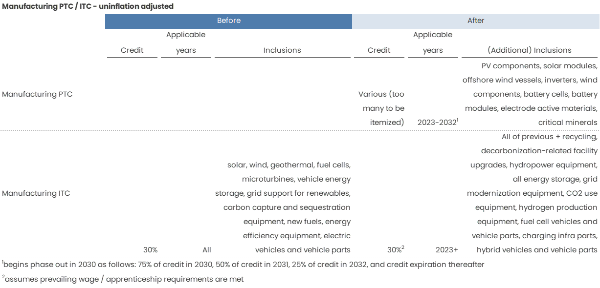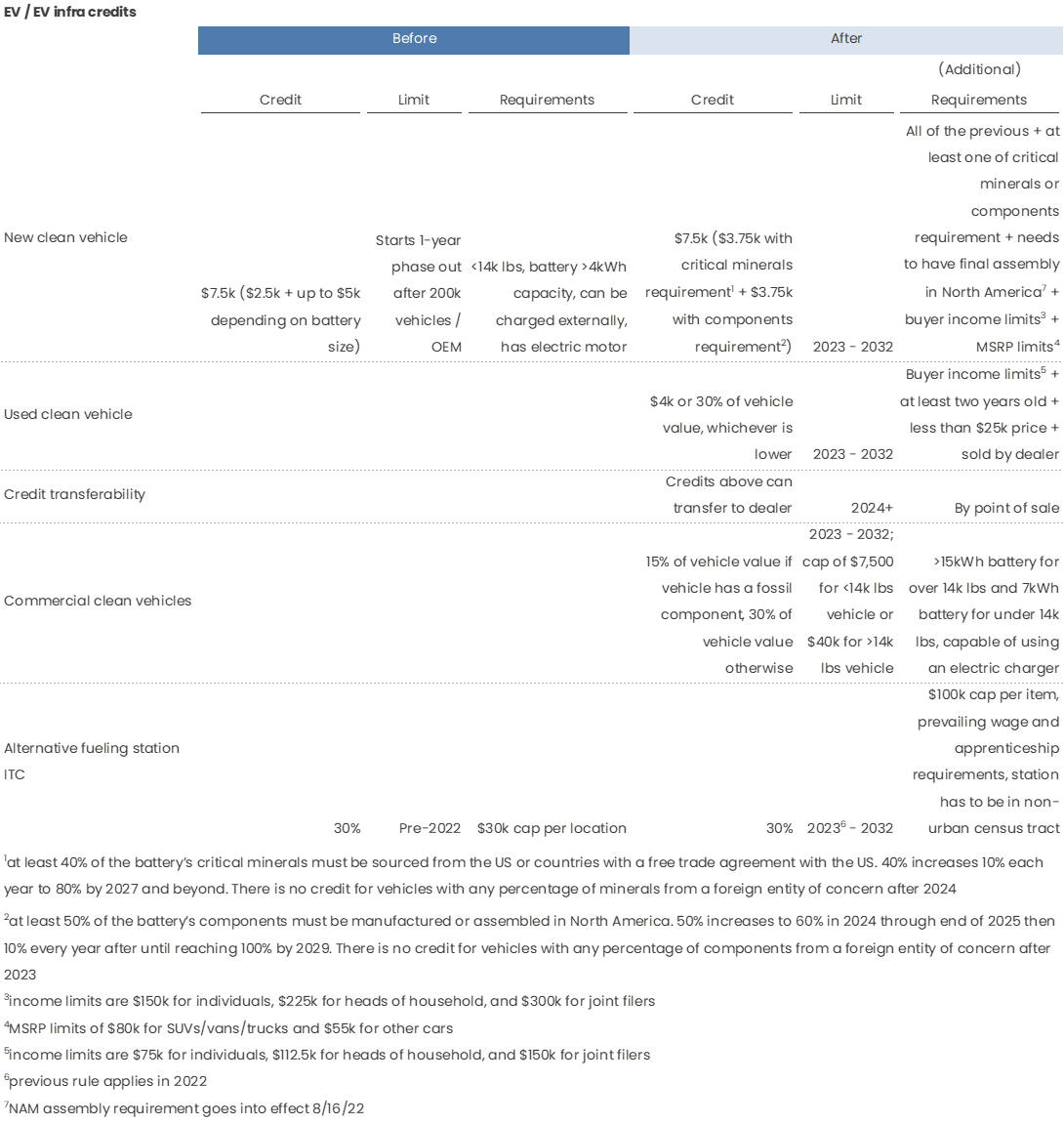 Prepare for an infrastructure rush. It’s clear that this bill was meant to spur US manufacturing and infrastructure development, but some of the deadlines are quite tight. The electricity ITCs and PTCs without the zero emissions requirement have a construction deadline of end of 2024, which means that projects pretty much need to be FID-ed in the next 2 years. Given this, we should see a lot of early stage infrastructure projects pop up in the next 6 months if this bill is passed.