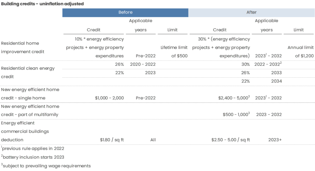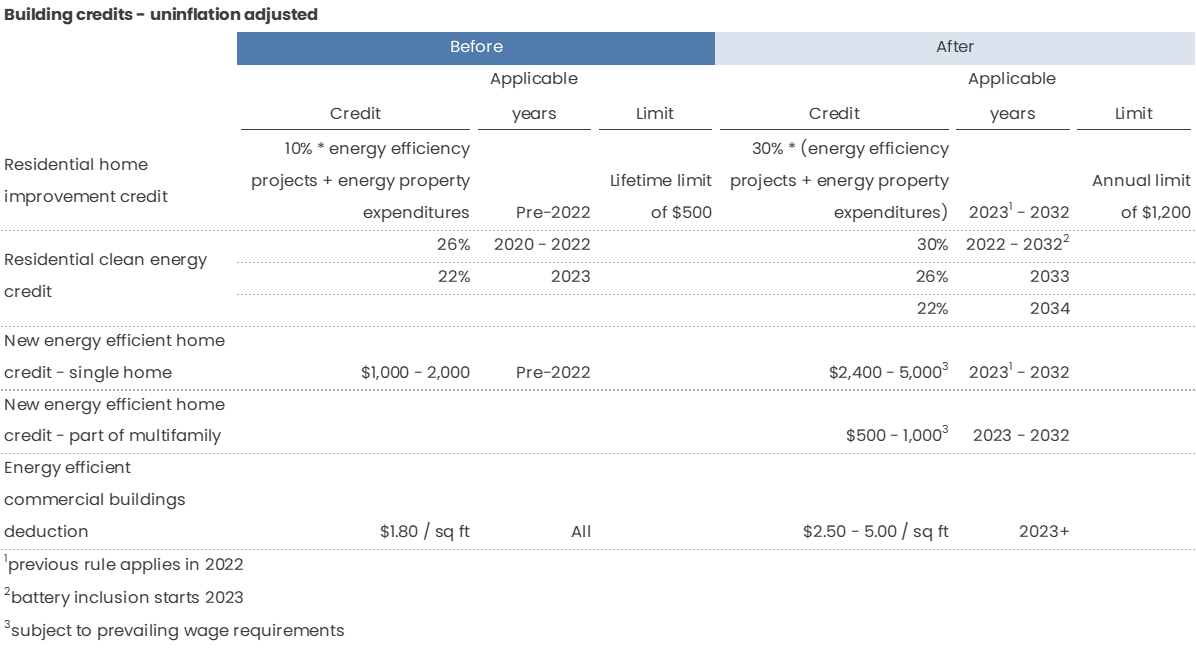 Effective 2023, raises the credits for energy efficiency improvements made to commercial buildings from $1.80 to $2.50 - $5.00 / sq ft (depending on how much energy costs are reduced) assuming prevailing wage and apprenticeship requirements are met