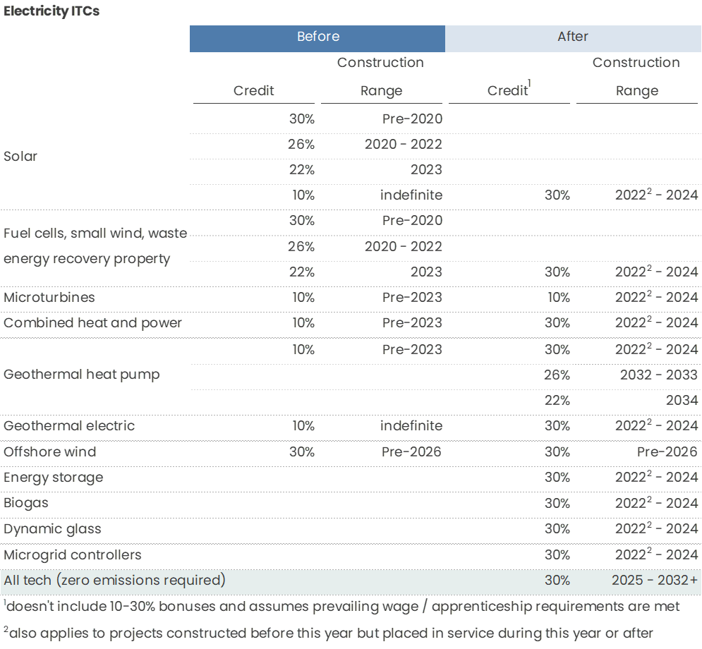ITC reverts back to the pre-phase down rate of 30% to solar, fuel cells, small wind, and waste energy recovery projects meeting the deadline (if constructed after 2019 and placed in service before 2022, the rate is 26%), stays at 10% for microturbines, and upgrades to 30% for geothermal electric, combined heat and power, and geothermal heat pumps (with the last item starting a phase out rate schedule starting 2033). Energy storage, biogas, dynamic glass, and microgrid controllers get added to the 30% rate category. These rates are only available with prevailing wage and apprenticeship requirements and is otherwise divided by 5 (6% and 2%) if those requirements are not met