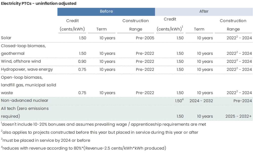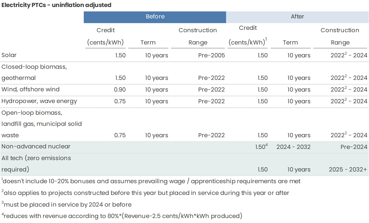 Clean Electricity Production Credit - Starting in 2025, any zero-emissions facilities regardless of technology can qualify for a 1.5 cents / kWh PTC (assuming prevailing wage and apprenticeship requirements are met) for 10 years + 10% bonuses like above