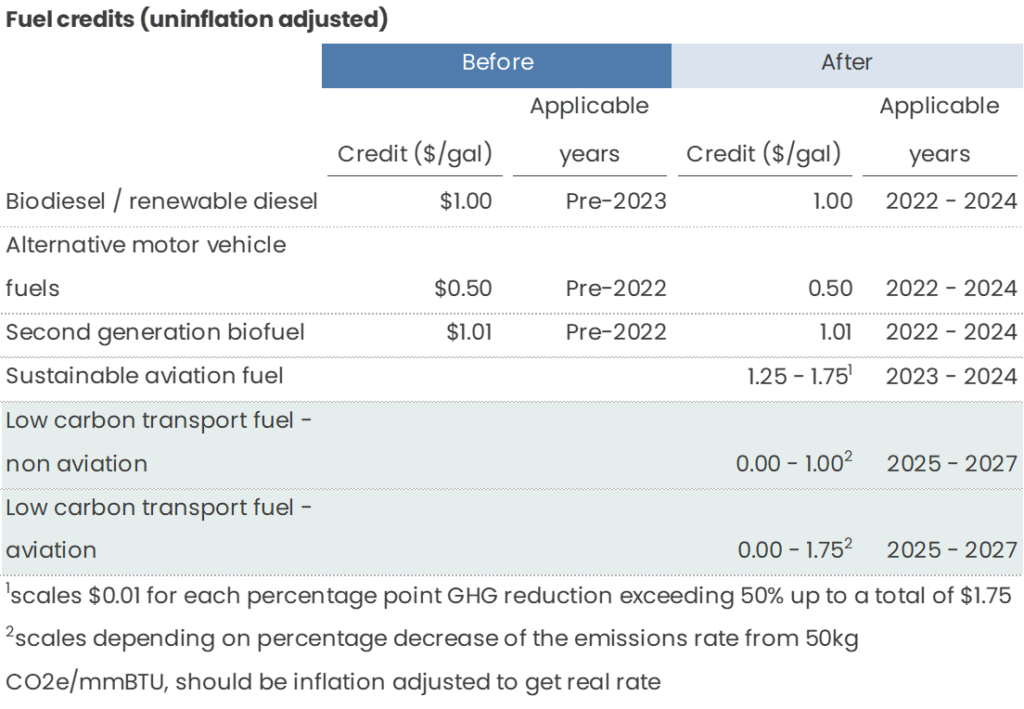 Clean Fuel Production Credit – Starting in 2025, low carbon transportation fuel can qualify for a PTC of $1/gallon (assuming prevailing wage and apprenticeship requirements are met) * percentage decrease of the emissions rate from 50kg CO2e / mmBTU (e.g. 100% decrease, aka zero emissions fuel, would result in the full rate of $1/gallon)