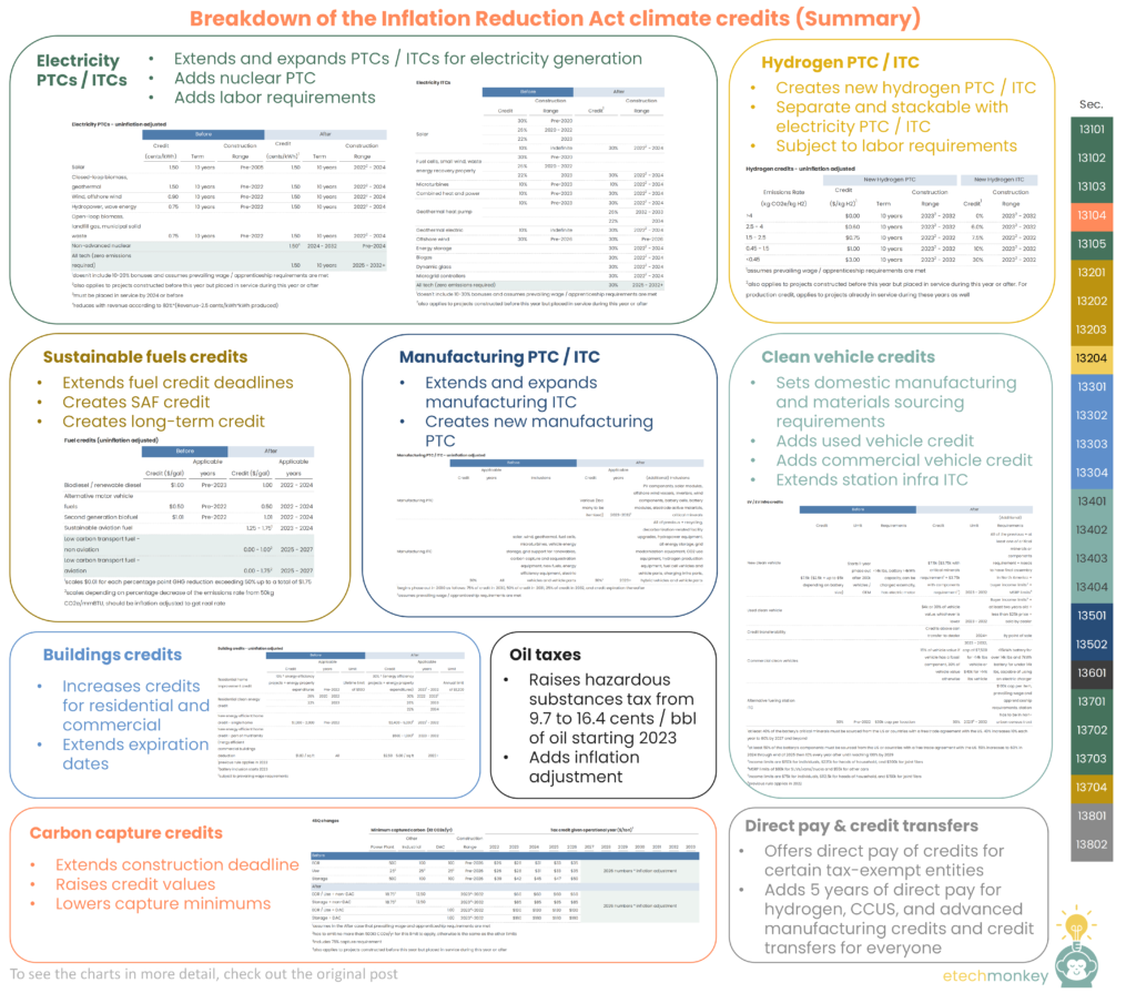 I’ve taken a (painfully) close read of the bill and summarized the climate credits provisions below. There are additional sections that provide funding for government entities / agencies for specific programs that aren’t covered but that are listed out in other sources, also below.