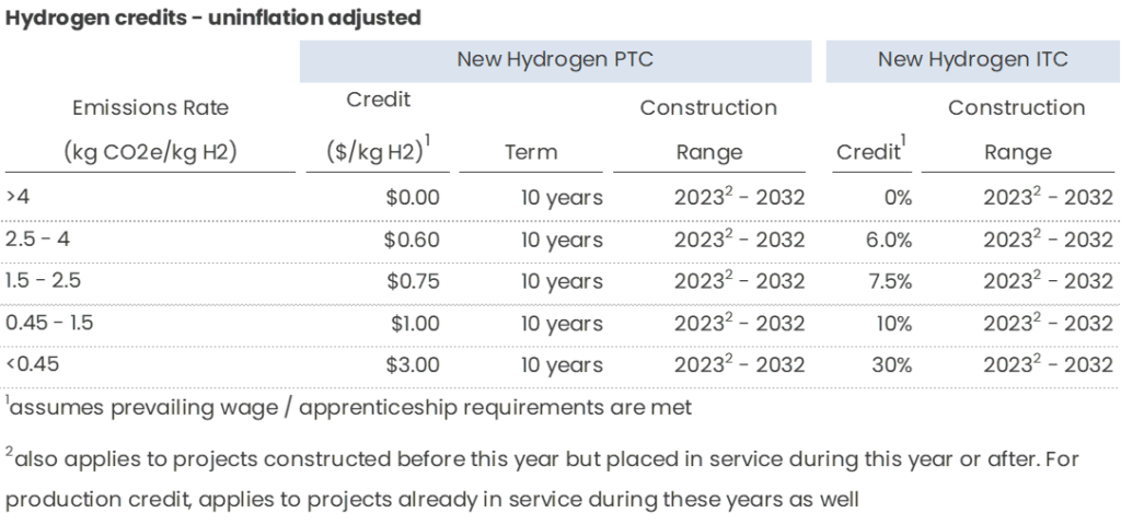 Potential PTC credit of up to $3 / kg if prevailing wage and apprenticeship requirements are met (otherwise divided by 5) and according to this emissions rate schedule: