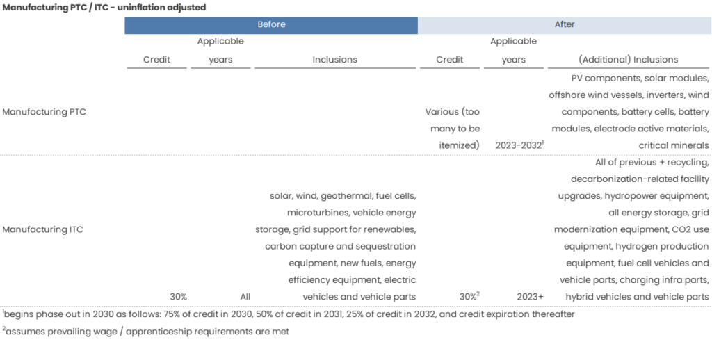 The big winners of the bill seem to be emerging technologies, especially CCUS and hydrogen. A theme throughout the legislation was broadening the scope of existing credits to non-renewable clean technologies. The manufacturing credits, for example, includes hydrogen equipment, carbon use, recycling, and fuel cells. The electricity ITC added in dynamic glass, biogas, energy storage, and microgrid controllers. The post-2025 electricity credits make a point to be technology agnostic. There’s an underlying message being sent that we’ll need more than renewables to get to net zero – and that’s a very good incorporation by this bill.